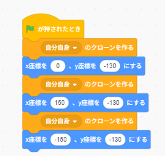 まずベルは、スプライトを何個もコピーして増やすんじゃなくて、**クローン(分身)**で3つ出す方法にしました。