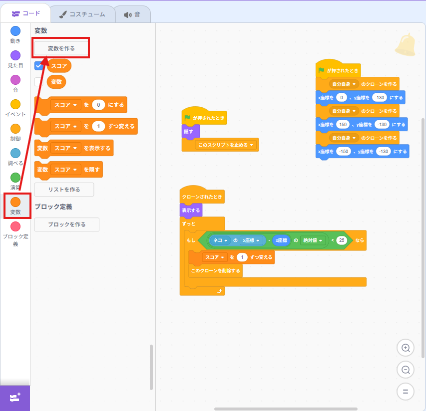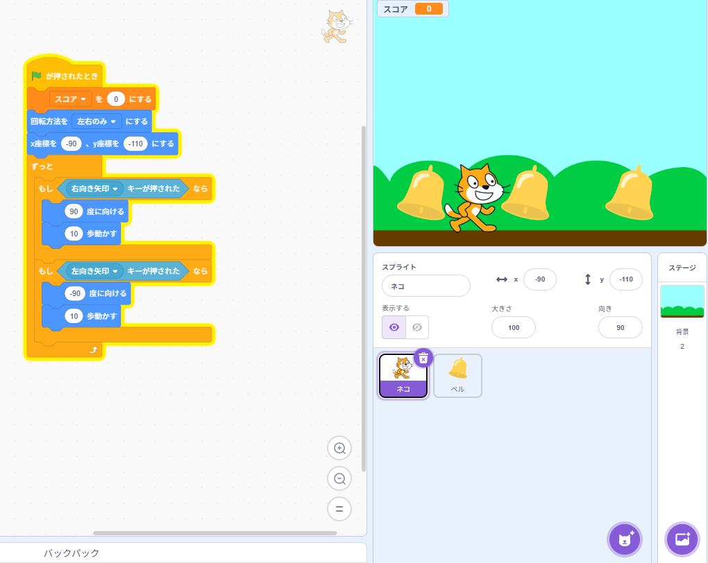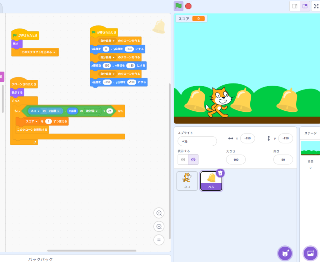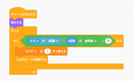 イメージとしては、ネコとベルの横の距離が25より小さければOK、という判定にしています。OKだったらスコアを1増やして、そのベル(クローン)だけ消します。