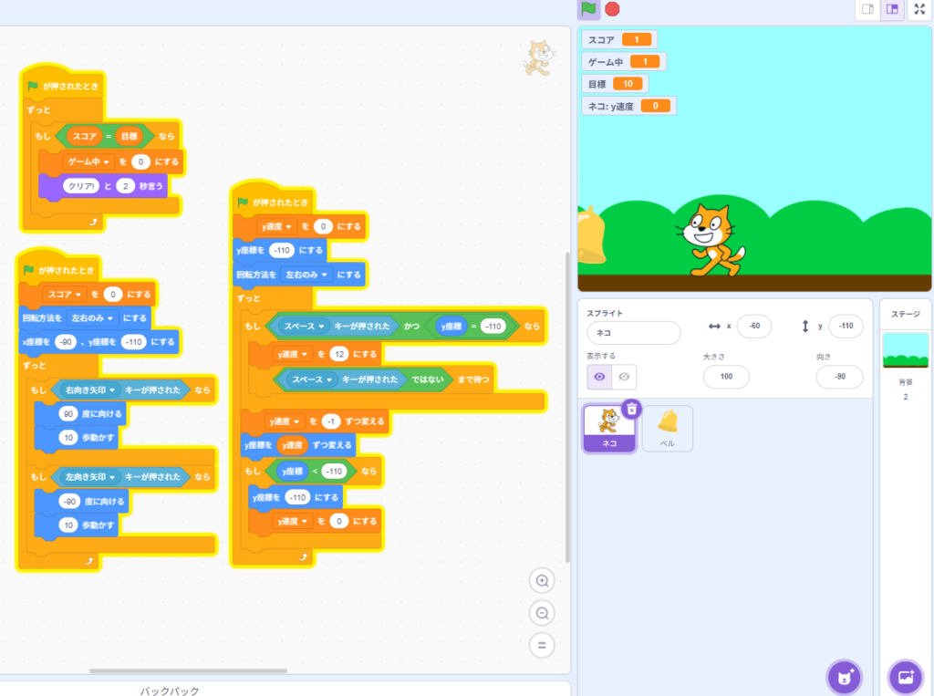 今回は、ベル集めゲームに ジャンプ(重力) を追加しました。