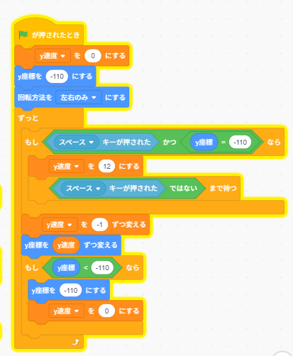 - もし「スペースキーが押された」かつ「y座標 = -110(地面)」なら